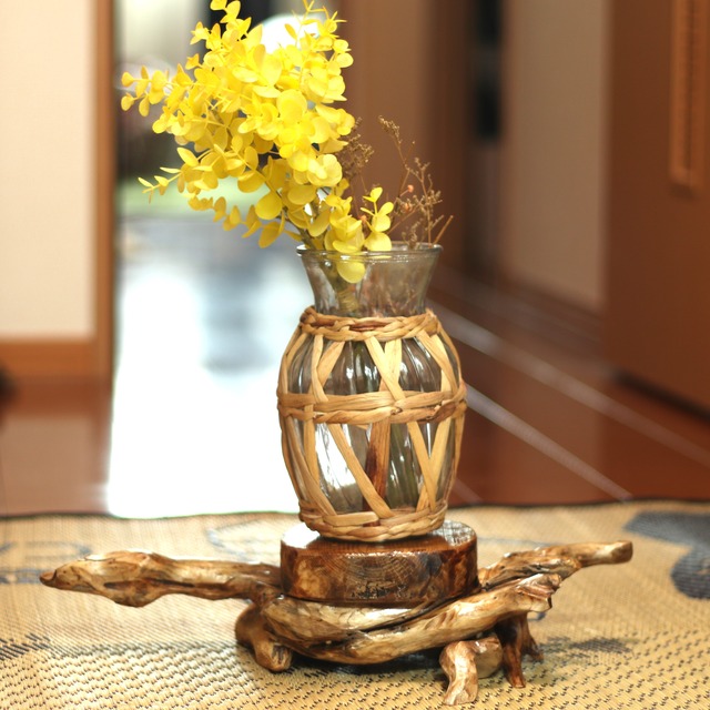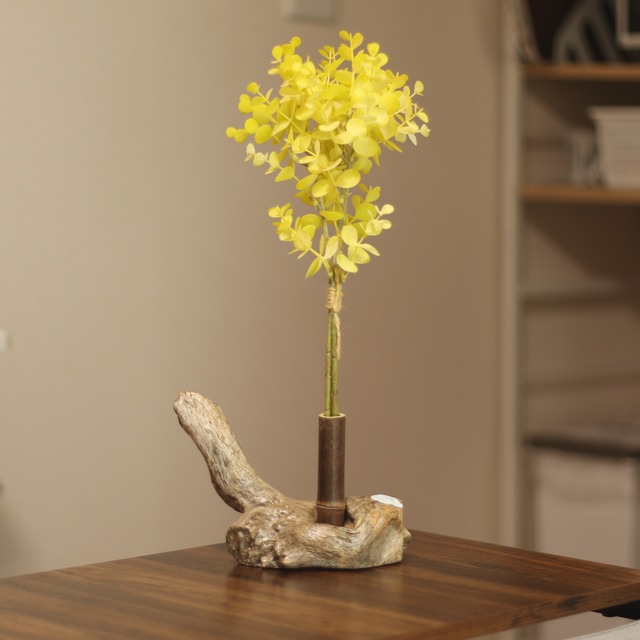 大型の一輪挿しです。 波打つ形の流木に直線の竹を合わせました。 土台はサイコロ型の木材を使用し、安定感があります。 写真で挿しているのは、 山形県産の紅花のドライフラワーです。